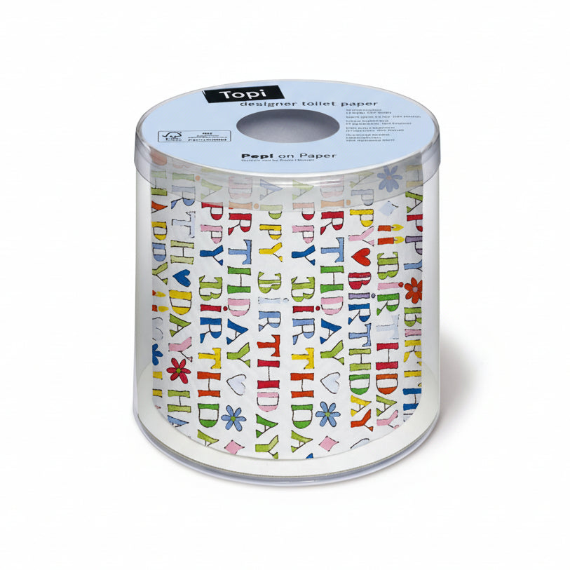 Happy Birthday. Das originelle Geburtstags-Toilettenpapier für beste Unterhaltung auf dem Klo. Verpackt in einer Klarsicht-Box.