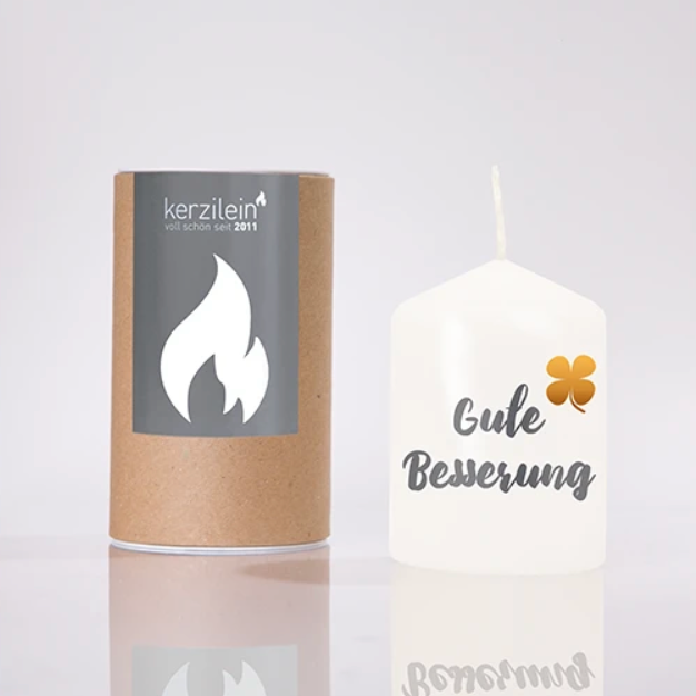 Gute Besserung, Flämmchen von Kerzilein, Stumpenkerze weiss, verpackt in einer runden Kartonverpackung