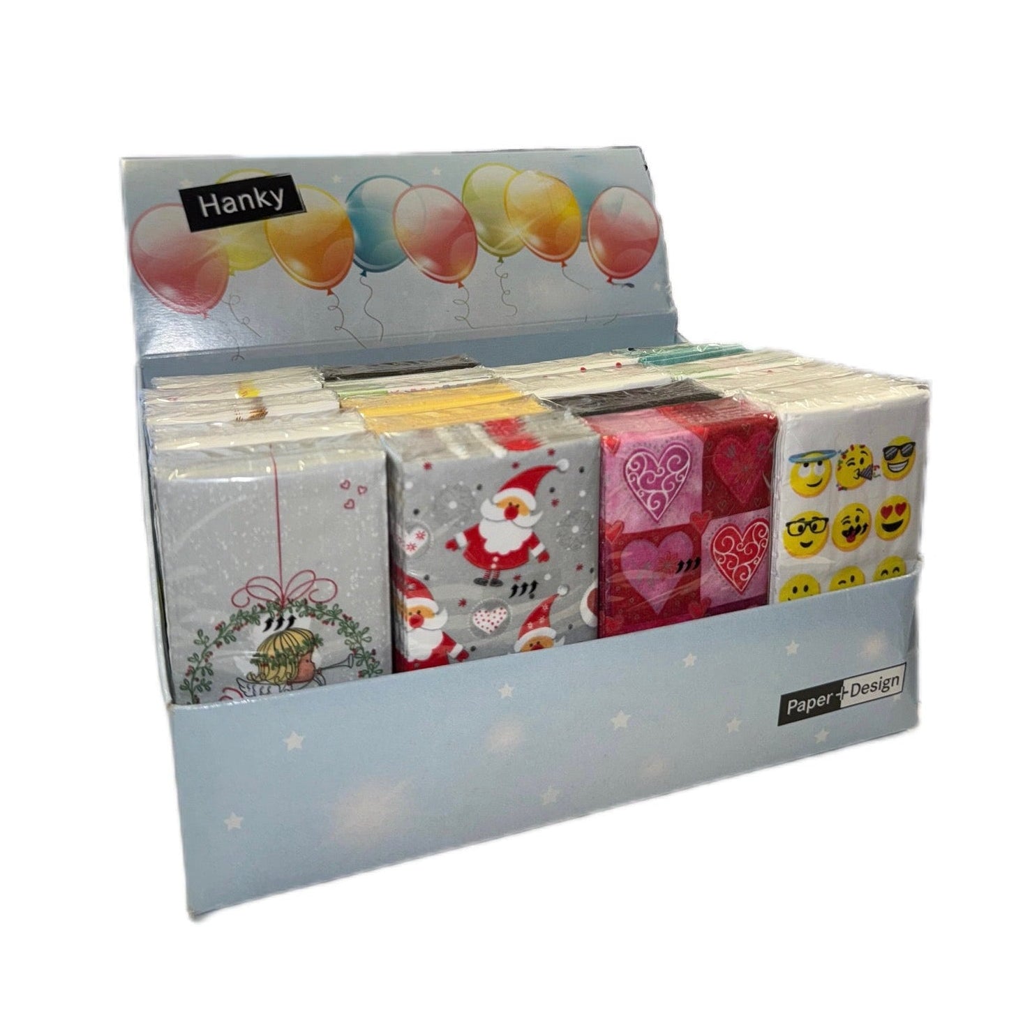 Bedruckte Papiertaschentücher. Diese Designer Taschentücher haben eine wiederverschließbare Verpackung und sind 4-lagig, chlorfrei gebleicht und umweltverträglich.