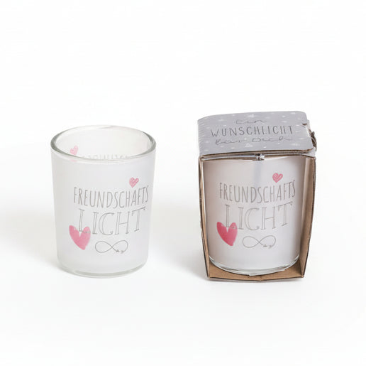 Windlicht aus Glas, geeignet für 1 Teelicht, umwickelt mit schönem bedruckten Pergamentpapier. 6 verschiedene Sprüche